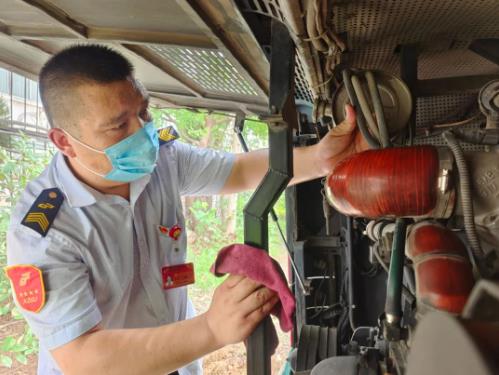 新區(qū)公司1780車駕駛員白延奇駕駛的19路線,由銅山新區(qū)總站發(fā)往徐州火車站,全程接近30.5公里,途徑居民區(qū)、學(xué)校眾多,每天要跑3趟,6個(gè)單程,不堵車的時(shí)候一個(gè)單程需要一個(gè)小時(shí)。“由于工作的特殊性,即便天氣再熱我們也不敢多喝水,早晚高峰堵車至少得1個(gè)多小時(shí)才能回到主站,只有到終點(diǎn)站才能多喝幾口水,抓緊時(shí)間上個(gè)廁所?!?/span>駕駛員白延奇這樣說(shuō)道。為了給市民乘客提供溫馨、舒適的車廂環(huán)境,每天朝陽(yáng)還未升起,白延奇就到達(dá)停車場(chǎng),檢查車輛狀況、擦拭發(fā)動(dòng)機(jī)、刷洗輪胎、打掃車輛衛(wèi)生,在確?!拔鍍粢涣痢钡耐瑫r(shí),對(duì)車廂進(jìn)行全面消毒,不一會(huì),白延奇的額頭就布滿了汗珠,身上的行業(yè)服早已濕透,緊緊地貼在皮膚上。