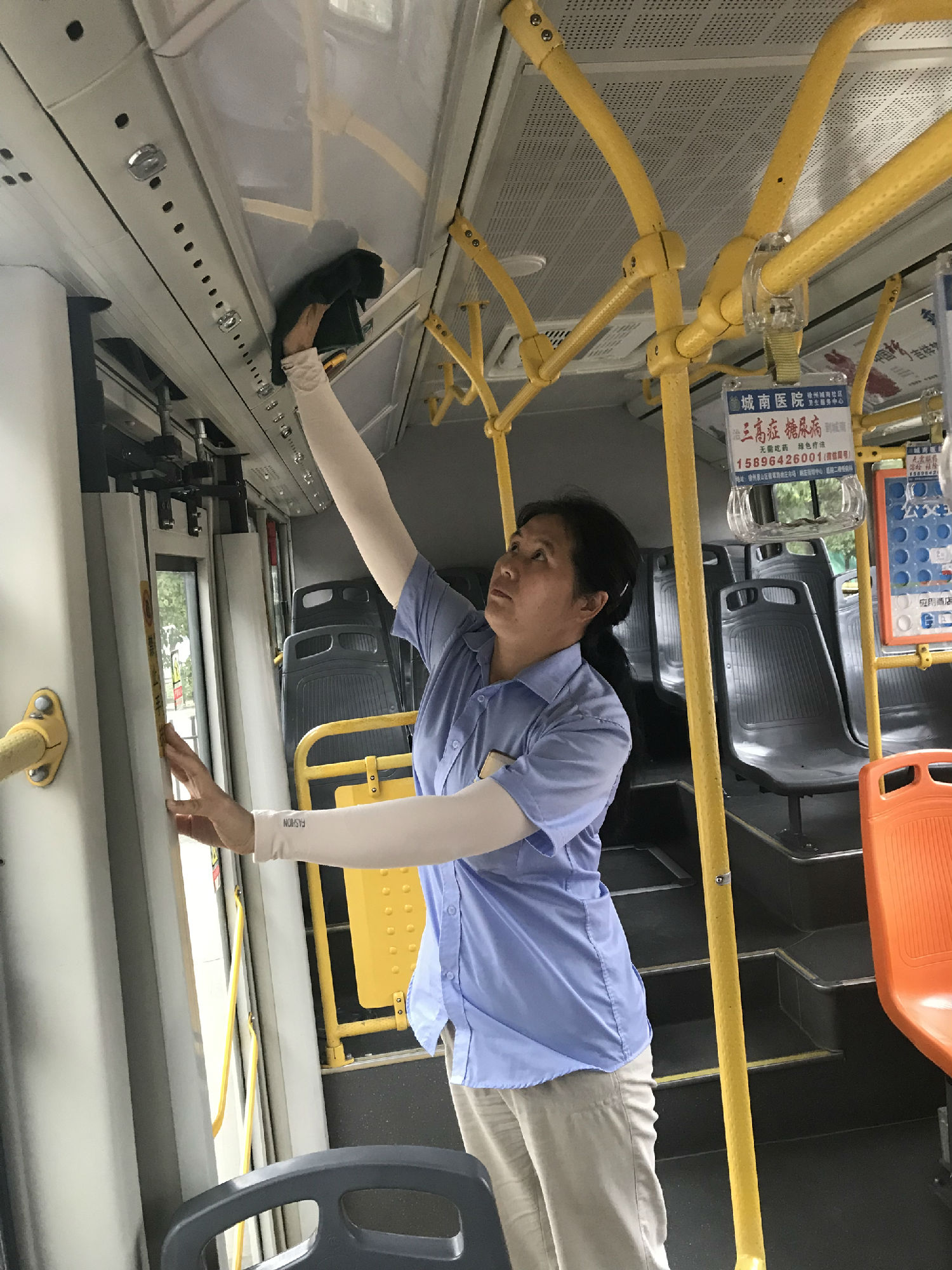 七點早高峰開始,她又趕到高鐵上客站,維持營運秩序,一遍一遍叮囑駕駛員按照服務(wù)“三五工作法”的要求,站頭站立式服務(wù)、照顧特需乘客,做好規(guī)范服務(wù)。早高峰過后,折回高鐵停車場,在班次時間允許的前提下,幫助駕駛員提水、擦玻璃、用最快的速度保證每臺車進行地板一趟一清掃、輪胎一趟一清刷,傾倒垃圾桶等。高鐵停車場經(jīng)常停水,沒有水怎么辦?她主動找到負(fù)責(zé)工地施工的灑水車,給放幾大桶水,每臺車拎一桶,放在車上,便于保潔。對于存在衛(wèi)生死角的車輛,權(quán)洪就利用休停時間,帶著駕駛員徹底進行大掃除,切實整改到位。在這高溫濕熱的天氣,她的衣服是干了又濕,濕了又干,她全然不顧,一心撲在工作上,從早到晚,從不叫累。