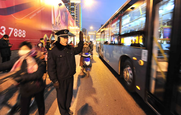 平安夜,客流增加,公交服務督導隊員有序指揮車輛,確保乘客走好走了