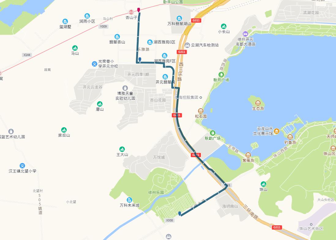 線路站點:山南小鎮(zhèn),山水龍瑞,馬場湖路口,馬場湖,怡康花園,后勤學院北,誠坤鋼材市場,蘇堤北路立交橋(西),蘇堤北路立交橋(東),蘇堤路小學,永業(yè)花園小區(qū),江蘇四監(jiān),銅沛路東口,中山北路立交橋