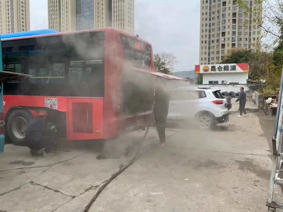目前,公交集團老舊車輛較多,純電動車輛占比較小,常規(guī)車輛年限使用較長,導致部分車輛發(fā)動機底部、機油散熱器、液壓助力轉(zhuǎn)向泵等部位表面長期附著油灰。各維保車間雖定期組織人員進行清理,但是受場地條件及設備因素制約,效果不明顯,機務安全隱患較大。為杜絕安全隱患,確保公交車輛正常使用,近日,徐州公交金通公司通過對外招標的形式簽訂專業(yè)干冰清洗公司,對公交車輛進行干冰清洗工作。