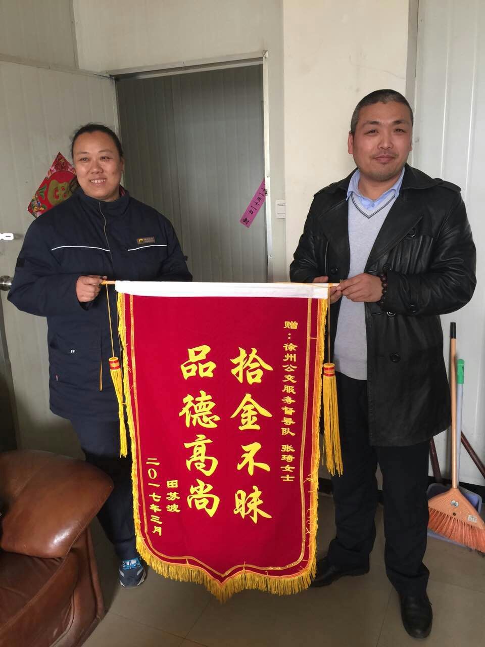3月29日,正在站臺執(zhí)勤的督導(dǎo)員張琦撿到乘客掉落的公文包,經(jīng)查看發(fā)現(xiàn)包內(nèi)有蘋果筆記本一臺和一個錢包,但并沒有找到皮包主人的聯(lián)系方式。張琦把包放在了調(diào)度室等待失主來認(rèn)領(lǐng),約一小時后失主匆忙趕來尋找。失主見到失而復(fù)得的皮包非常激動,經(jīng)過詢問得知失主姓田在徐州礦業(yè)大學(xué)工作。田先生說,“電腦里存有非常重要的資料和聯(lián)系方式,丟包之后萬分焦急,真心感謝公交督導(dǎo)員。”隨即從錢包里拿出400元錢塞給張琦作為答謝,張琦表示:“路不拾遺本就是自己的義務(wù),作為站臺督導(dǎo)員經(jīng)常會在站臺撿到乘客掉落的物品,不管東西貴重與否我們都會幫失主妥善保管等待認(rèn)領(lǐng)。”3月31日,田先生和他的愛人送來錦旗表示感謝!