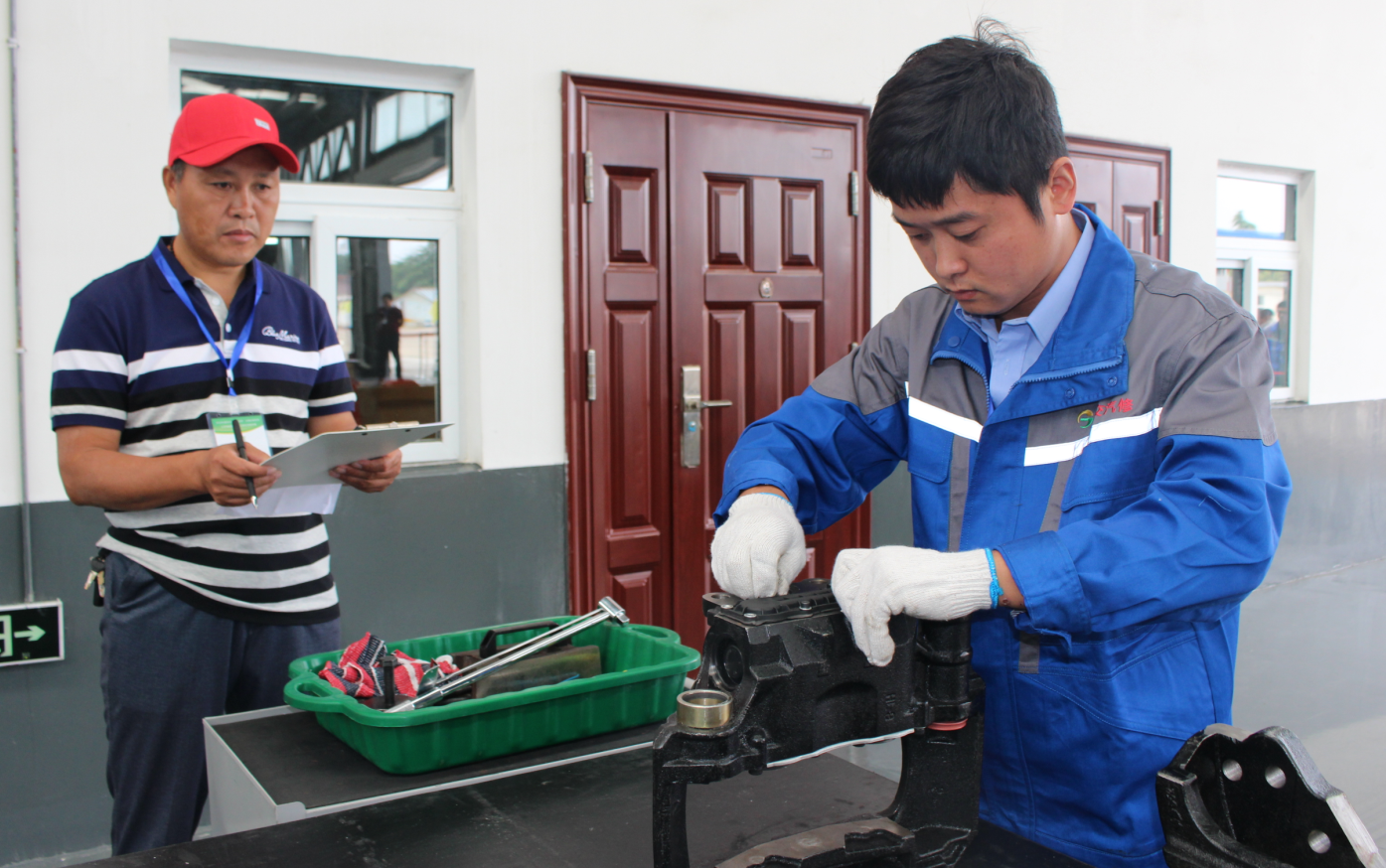 比賽開始了!參賽選手們穿戴整齊的工作服,個(gè)個(gè)卯足了勁,整裝待發(fā)。整潔的維修車間兩個(gè)工作臺(tái)上,四組修理人員同時(shí)進(jìn)行盤式制動(dòng)器拆裝組合的項(xiàng)目比賽,四名裁判員認(rèn)真對(duì)照標(biāo)準(zhǔn)計(jì)分,現(xiàn)場(chǎng)安靜得只聽見制動(dòng)器拆裝時(shí)輕微的“啪啪”聲。一旁的4個(gè)檢修地溝上,分別停著4輛新能源純電動(dòng)公交車,同時(shí)進(jìn)行著新能源車電控故障排除項(xiàng)目的比賽。參賽人員時(shí)而在駕駛室時(shí)而在車廂尾部檢修電路,裁判員根據(jù)實(shí)際操作隨機(jī)提問、記錄。